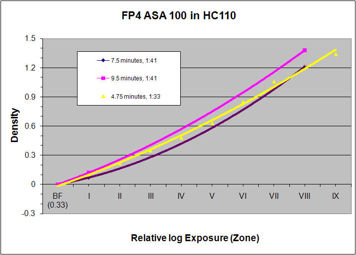 I recently changed to a different dilution 1:41, or 12ml HC110 to 488 ml water and increased the time to 9.5 minutes. The densitometry of this configuration works well for grade 2 and 3 papers on a cold light.